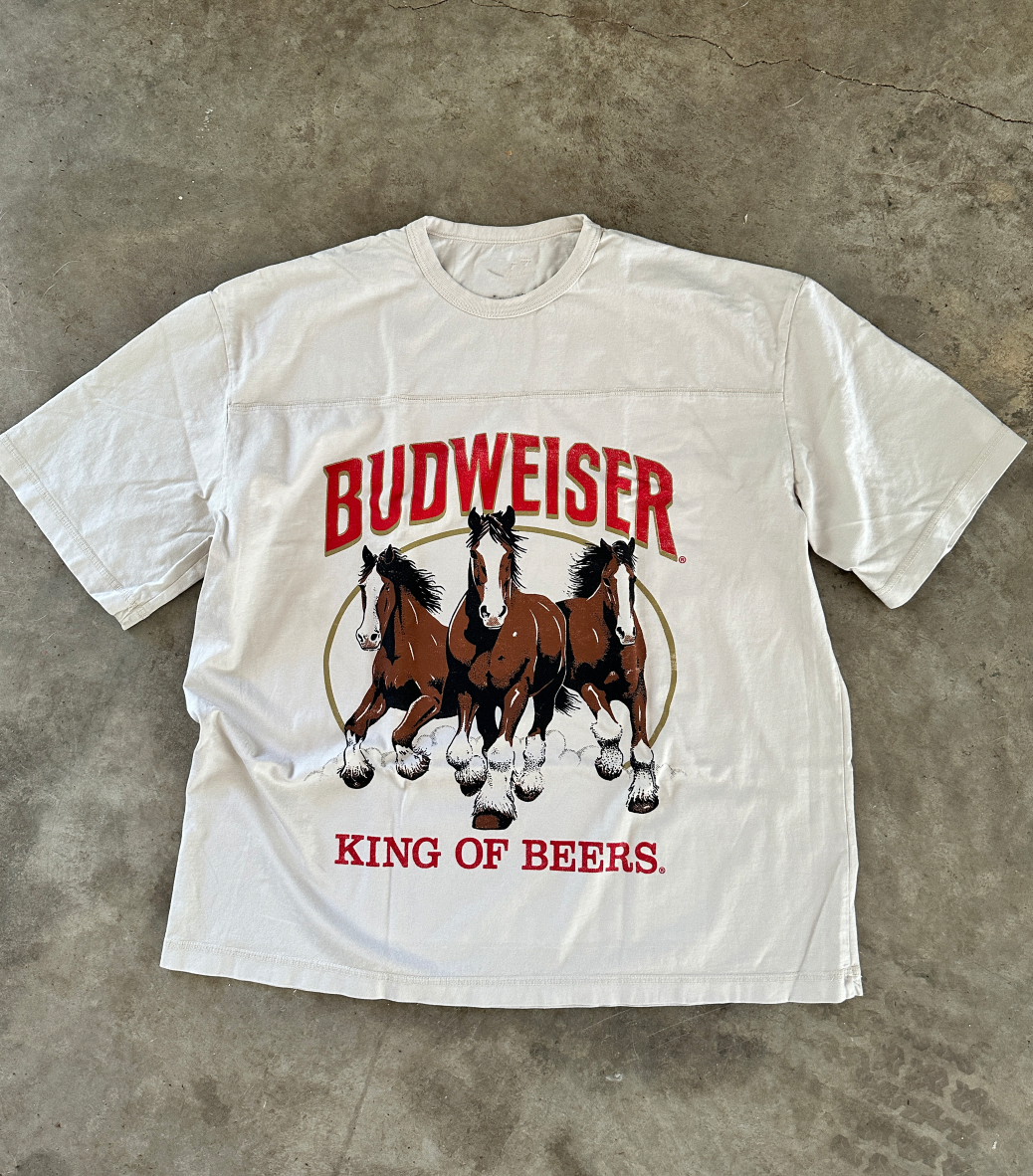 Printed on a unisex fit, 100% cotton drop shoulder tee with a licensed Budweiser retro graphic. Our graphic prints are sustainably made with non-toxic dyes and meets the OEKO-TEX Standard 100.