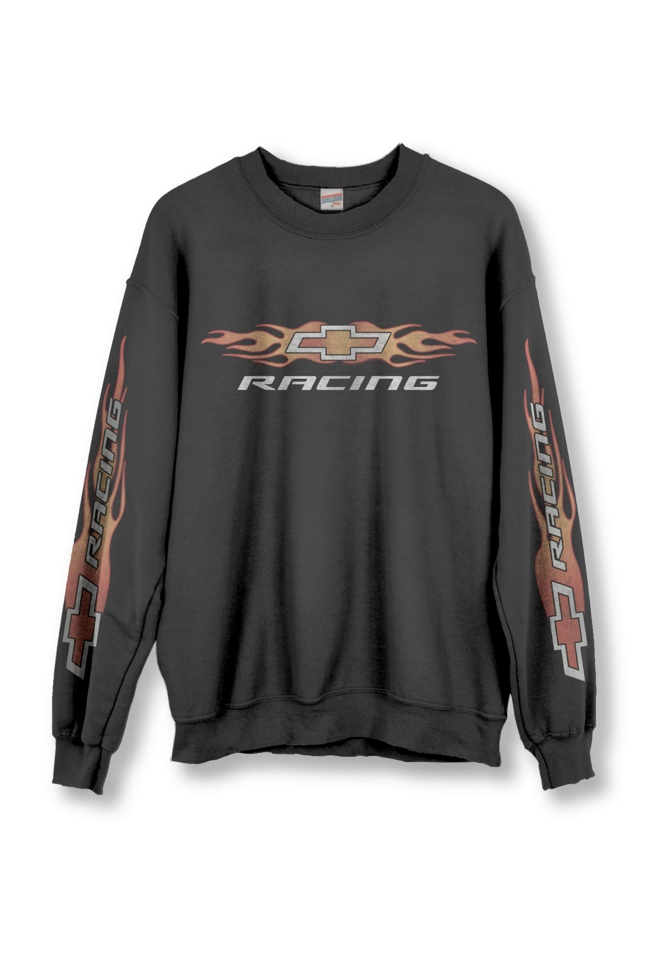 Printed on a unisex fit sweatshirt with a licensed Chevy retro graphic with flames on both sleeves. 50% cotton blend. Our graphic prints are sustainably made with non-toxic dyes and meets the OEKO-TEX Standard 100.