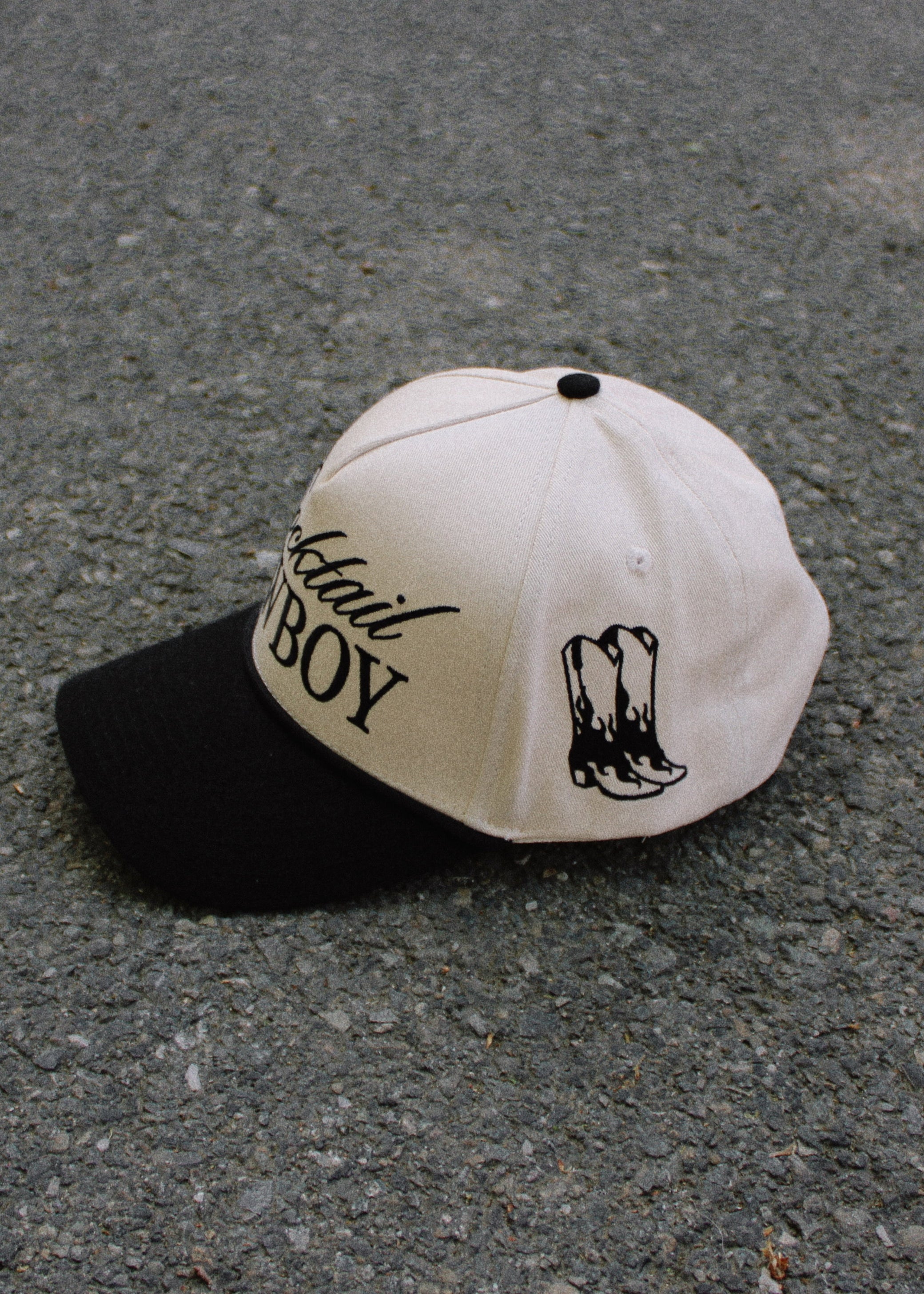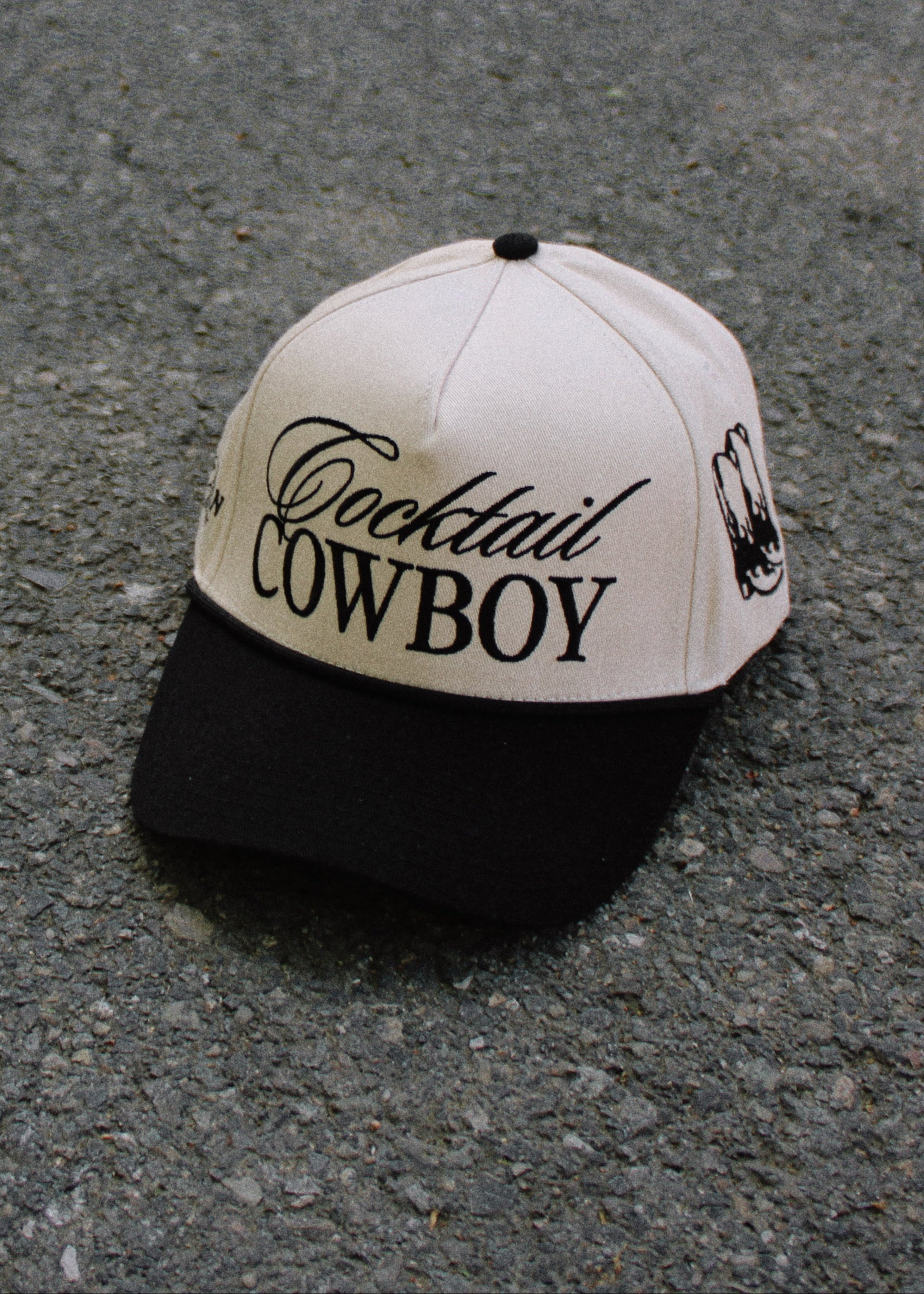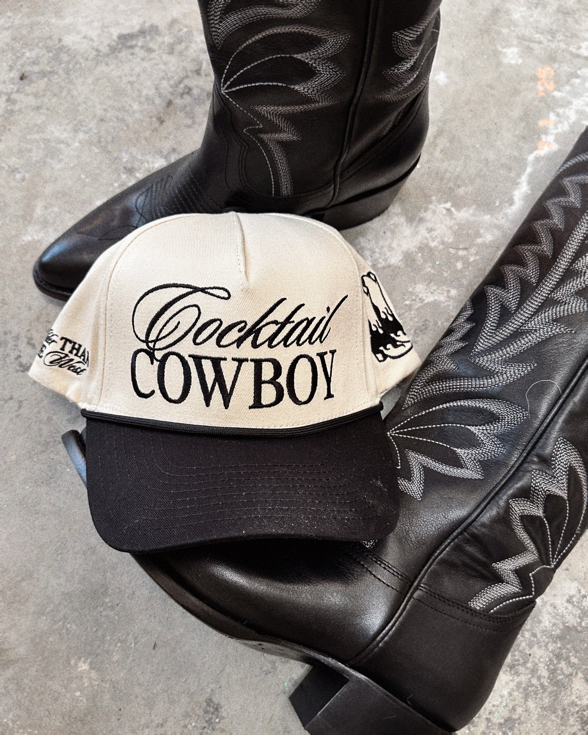 An exclusive cut and sew Slater Vintage structured 5-panel hat with Cocktail Cowboy embroidered on the front, wilder than the west embroidered on one side, and our iconic Slater Vintage flaming cowboy boots embroidered on the other side. Cream canvas hat base and a blank bill with an adjustable snapback. Unisex sizing, so one size fits most y’all.