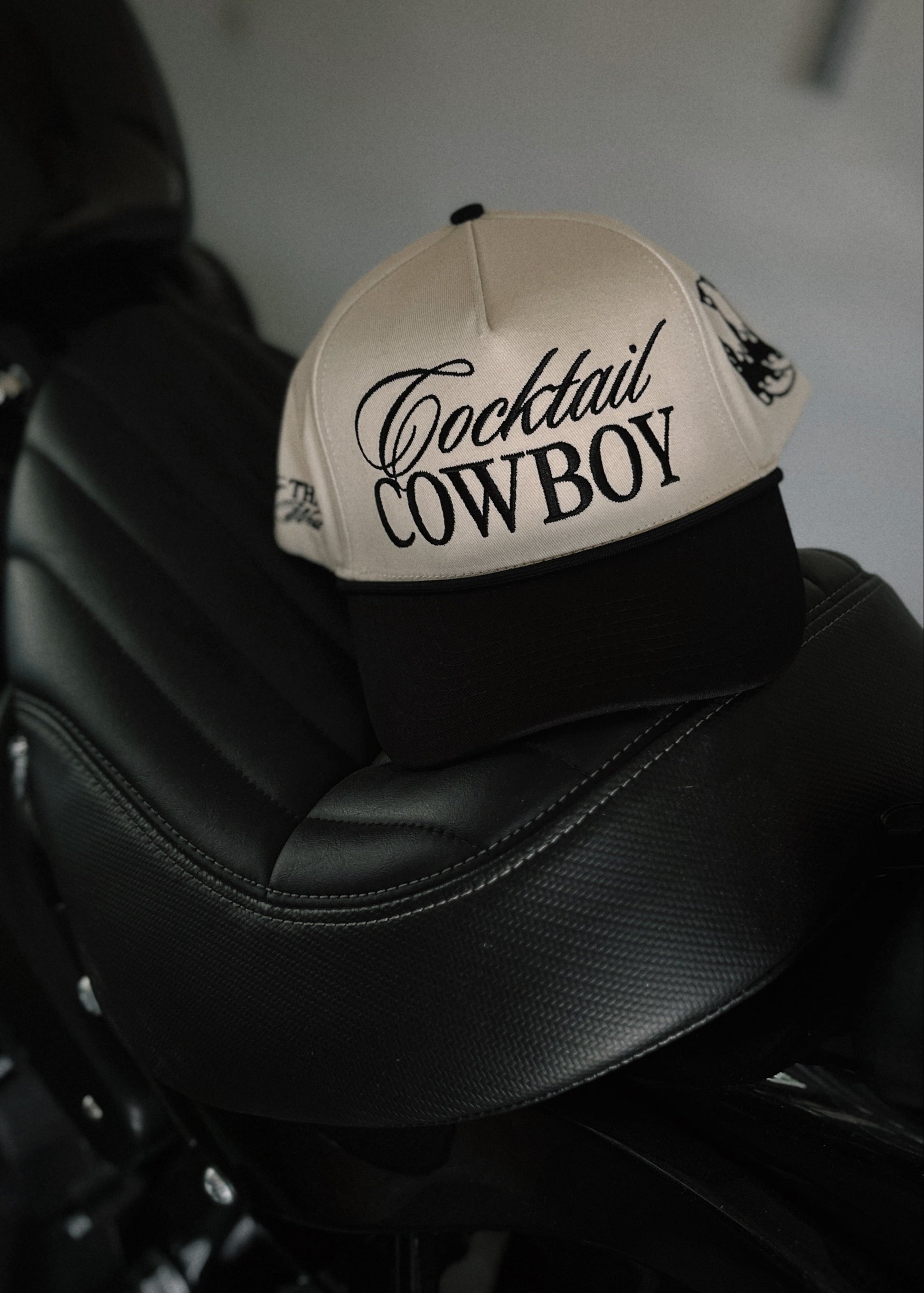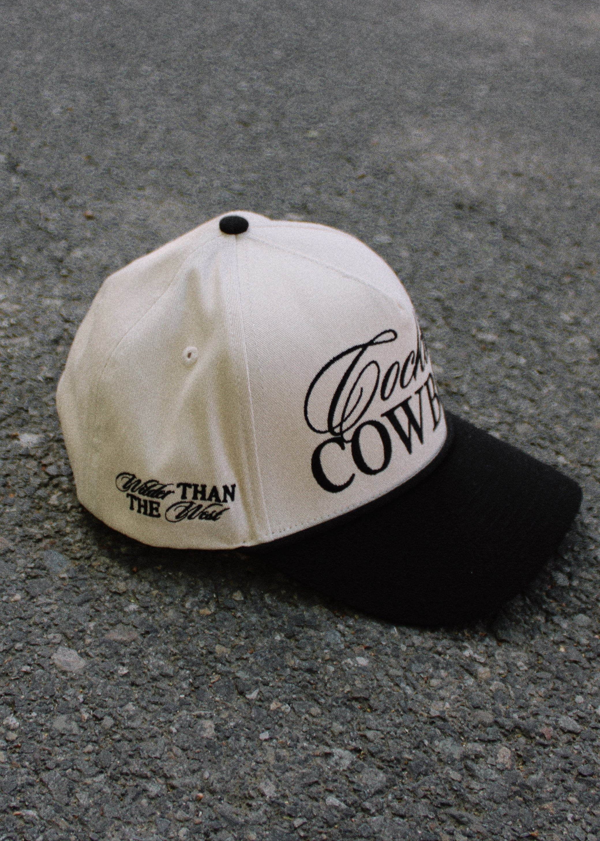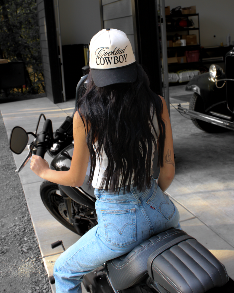 An exclusive cut and sew Slater Vintage structured 5-panel hat with Cocktail Cowboy embroidered on the front, wilder than the west embroidered on one side, and our iconic Slater Vintage flaming cowboy boots embroidered on the other side. Cream canvas hat base and a blank bill with an adjustable snapback. Unisex sizing, so one size fits most y’all.