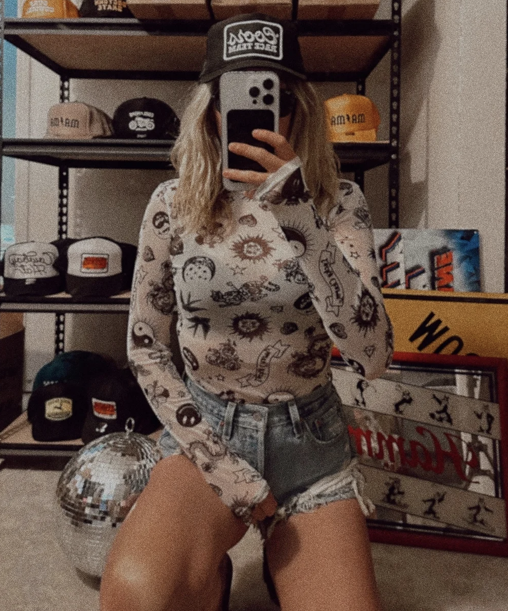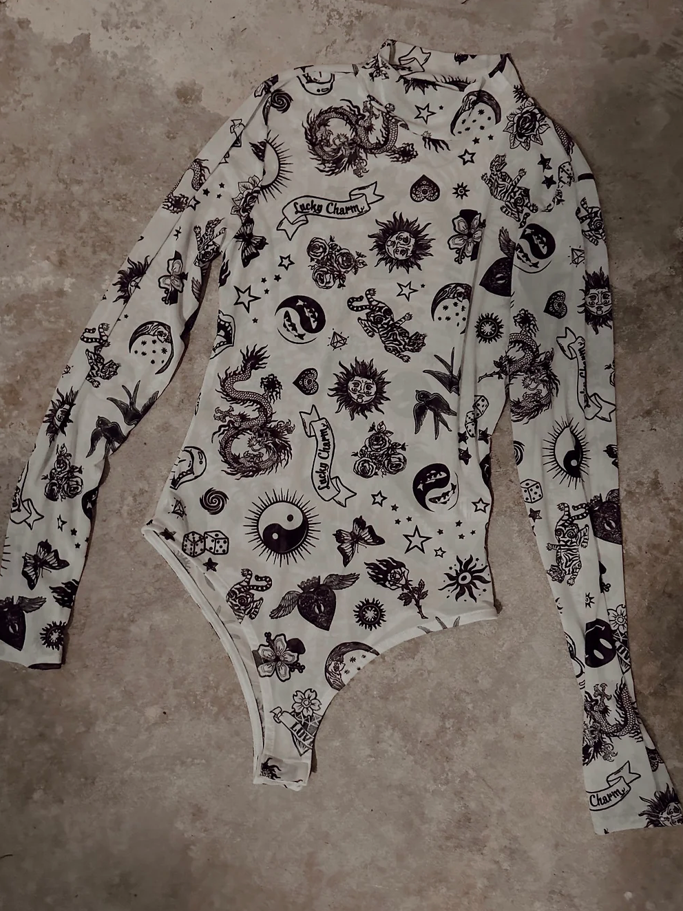 Channel your inner badass in our lucky charm mesh bodysuit. Featuring a trendy "howdy" pattern that is made from breathable mesh material - it's perfect for layering or wearing alone for a fun, effortless look. Semi sheer white mesh bodysuit with mock neckline and snap closure. Runs true to size with stretch.