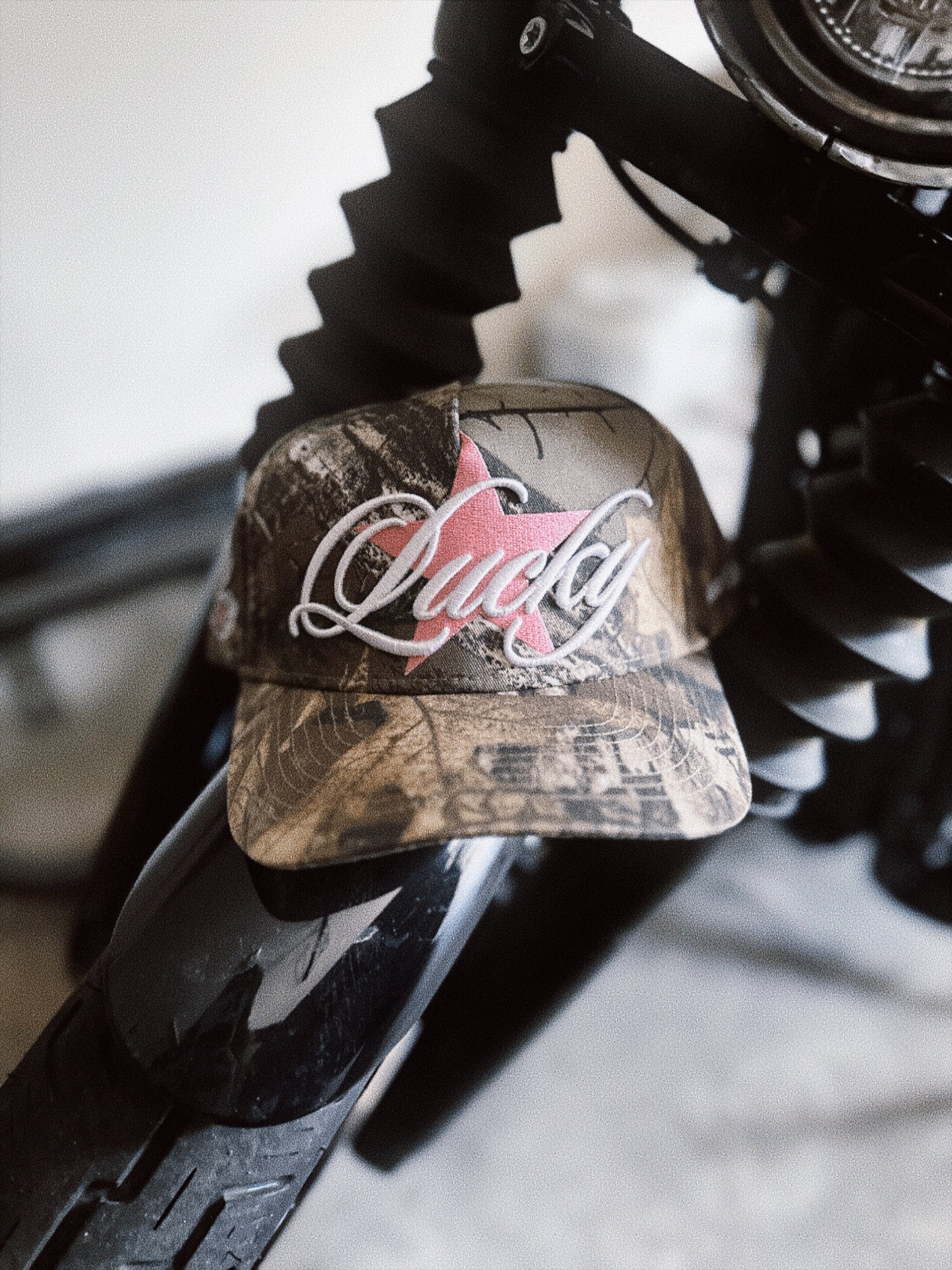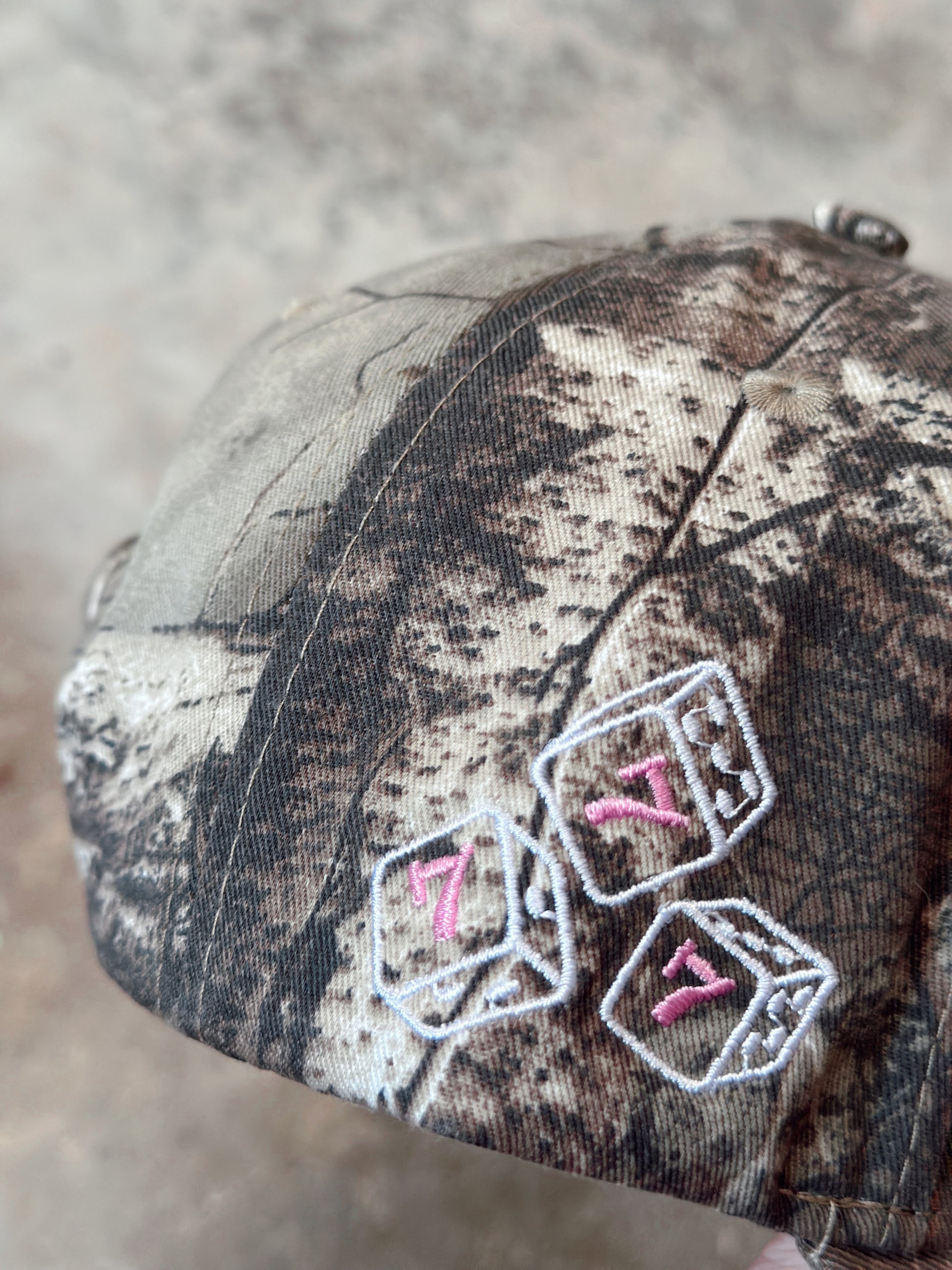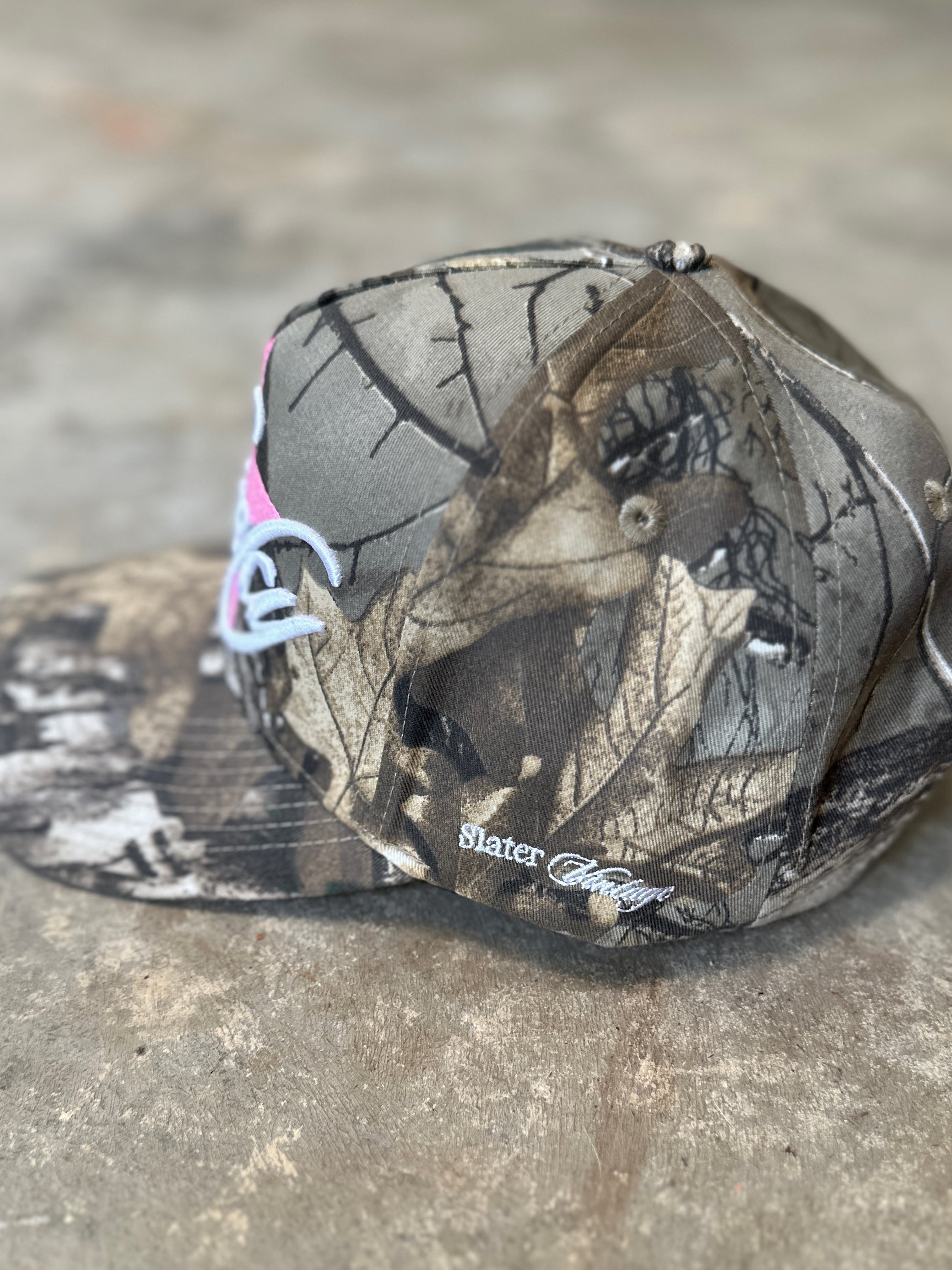 An exclusive cut and sew Slater Vintage structured 5-panel hat with puff embroidery on the front, dice embroidered on one side, and Slater Vintage embroidered on the other side. Custom camo hat base with an adjustable snapback. Unisex sizing, so one size fits most y’all.