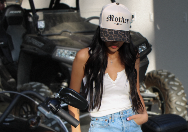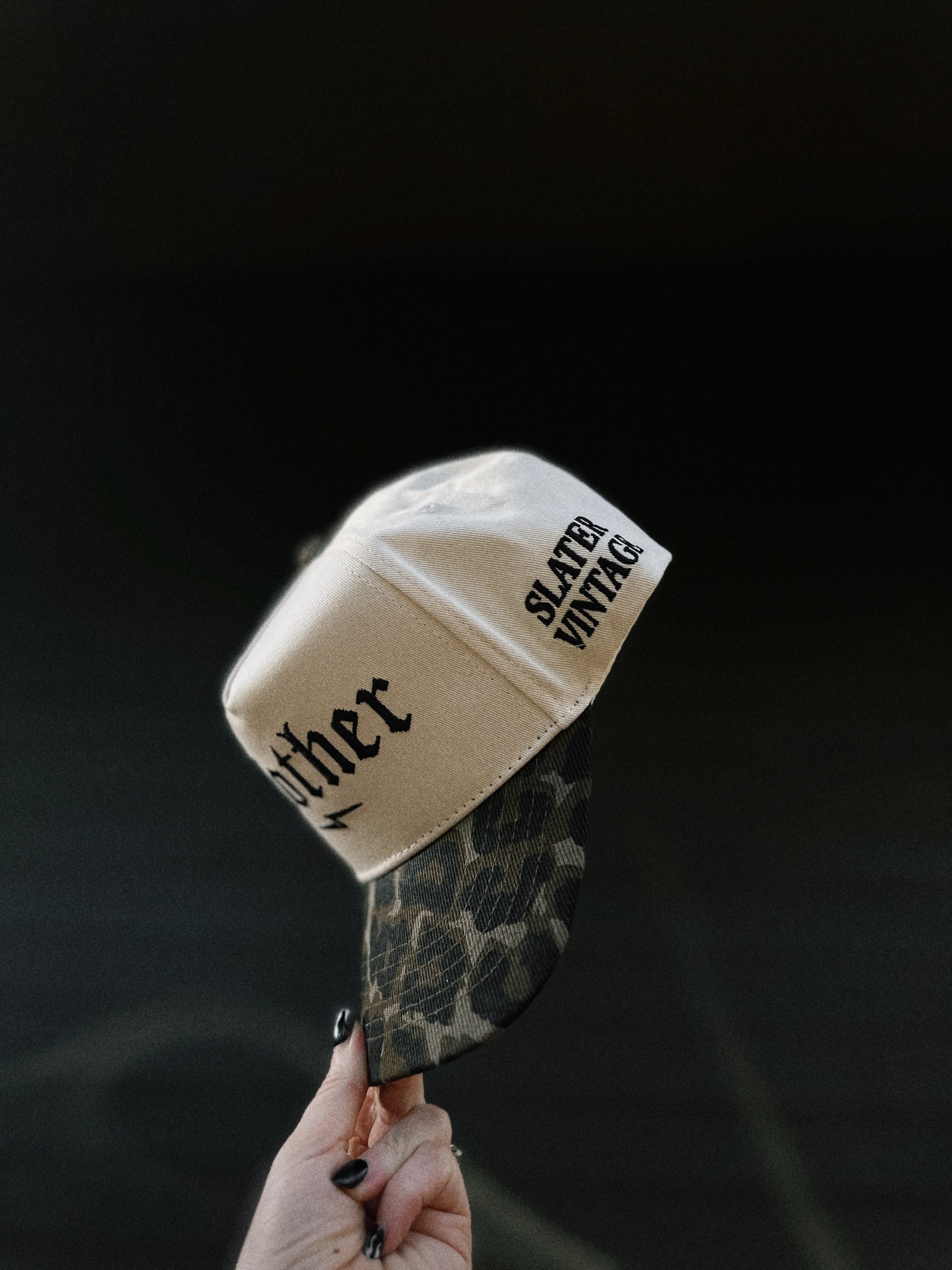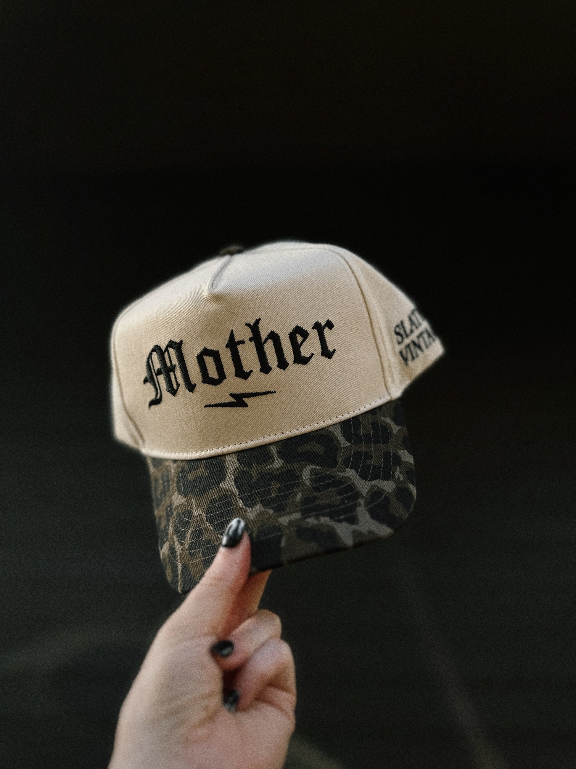 An exclusive cut and sew Slater Vintage structured 5-panel hat with Mother embroidered on the front and Slater Vintage embroidered on the side. Cream canvas hat base and a leopard print bill with an adjustable snapback. Unisex sizing, so one size fits most y’all.