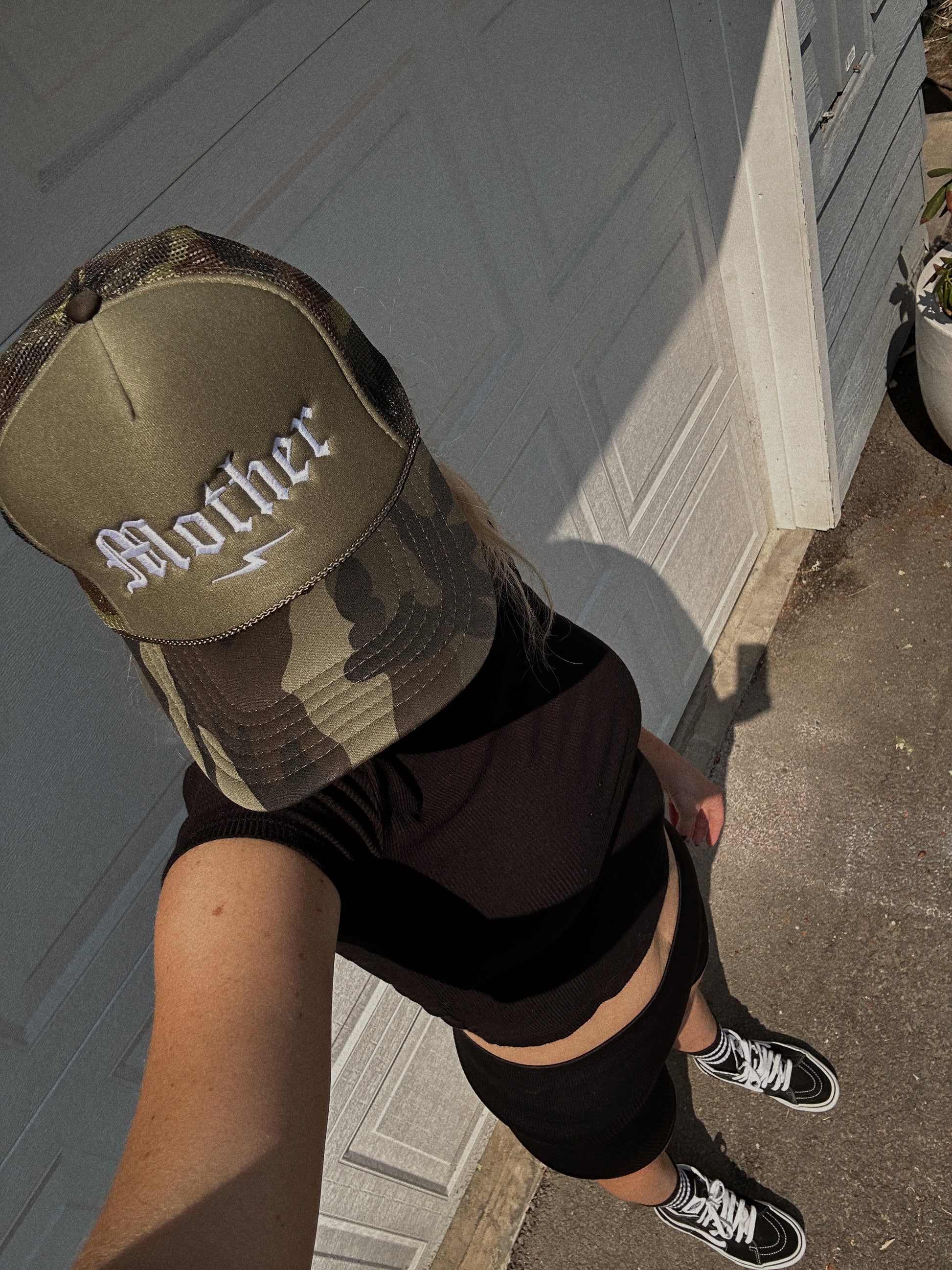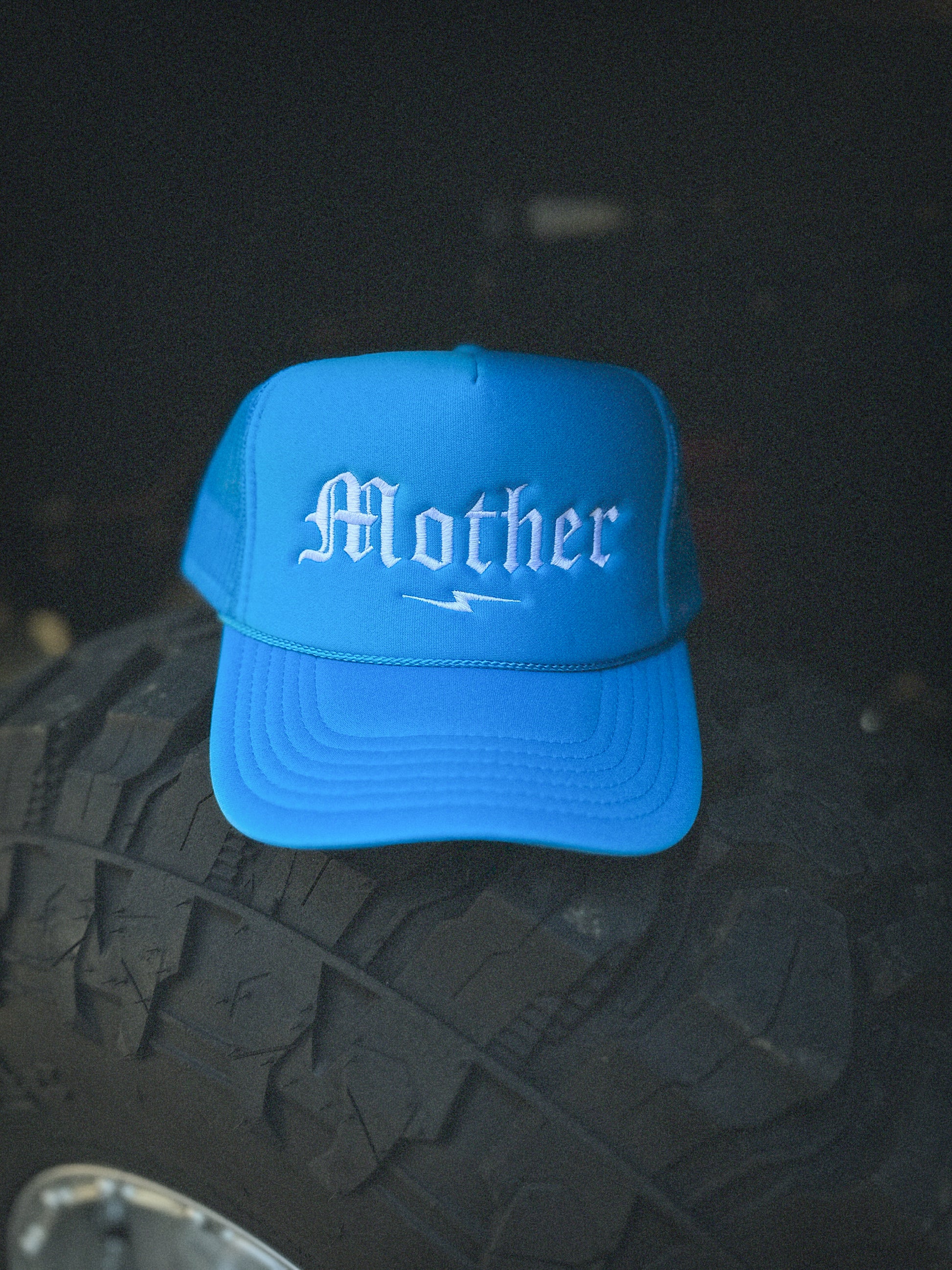 Trucker style captain hat with foam front + mesh back. "Mother" embroidered on the front. Onyx color hat base with rope detail across brim. Adjustable snap back, one size fits all.