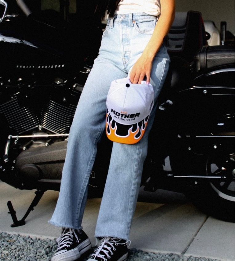 An exclusive cut and sew Slater Vintage structured 5-panel hat with Mother Racing puff embroidered on the front, "In Moms We Trust" embroidered on one side, and checkered flags embroidered on the other side. White canvas hat base, mid profile, and a flame decorated bill with an adjustable snapback. Unisex sizing, so one size fits most y’all.