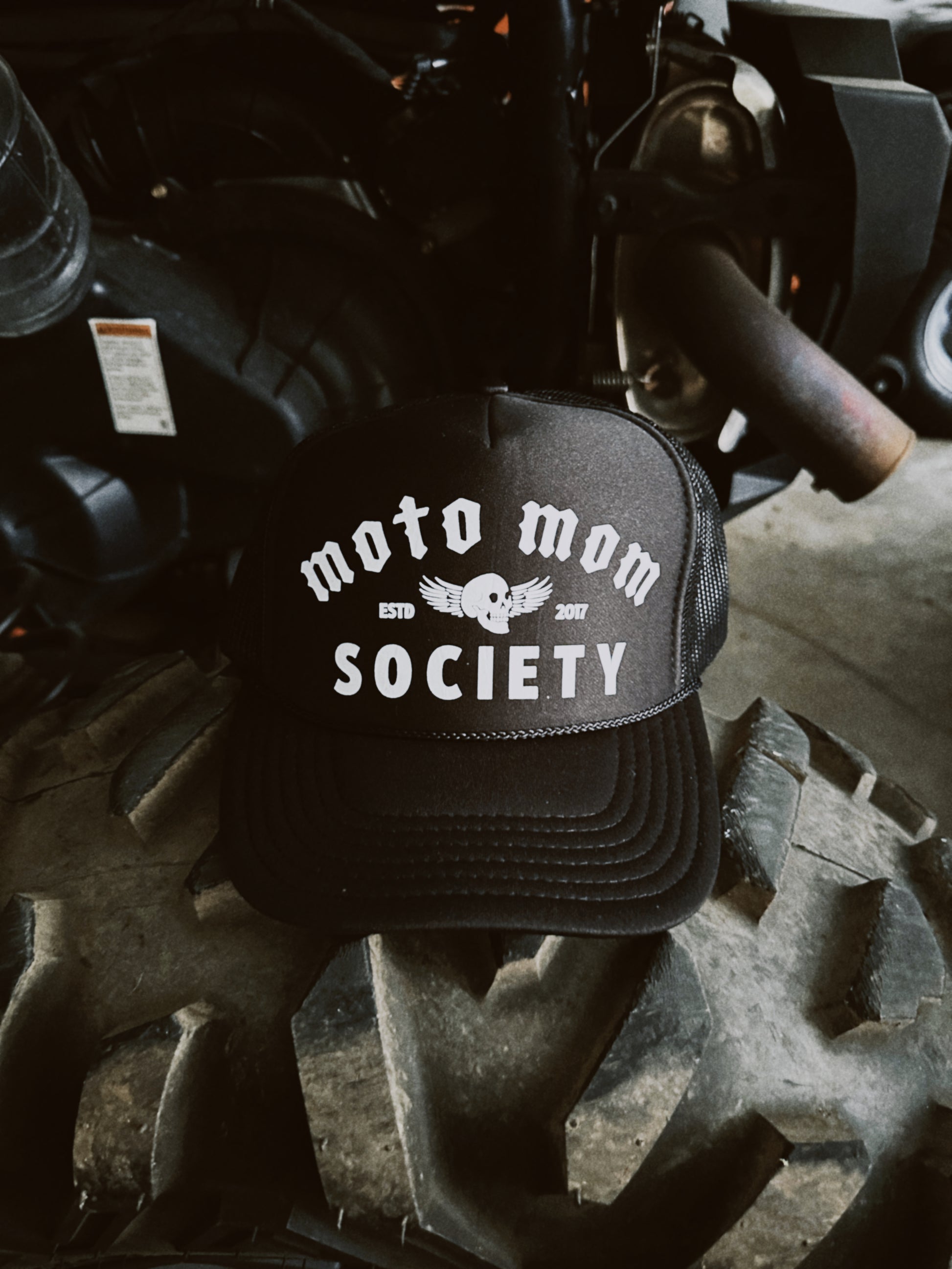 Trucker style captain hat with foam front + mesh back. Retro graphic on the front. Onyx color hat base with oak leaves and rope detail across brim. Adjustable snap back, one size fits all.