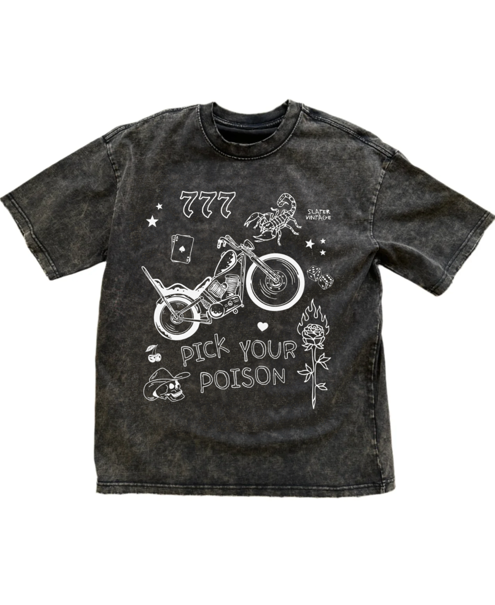 Printed on a unisex fit, boxy tee with hand drawn Slater Vintage graphics. 100% cotton with distressing at neckline. Our graphic prints are sustainably made with non-toxic dyes and meets the OEKO-TEX Standard 100.