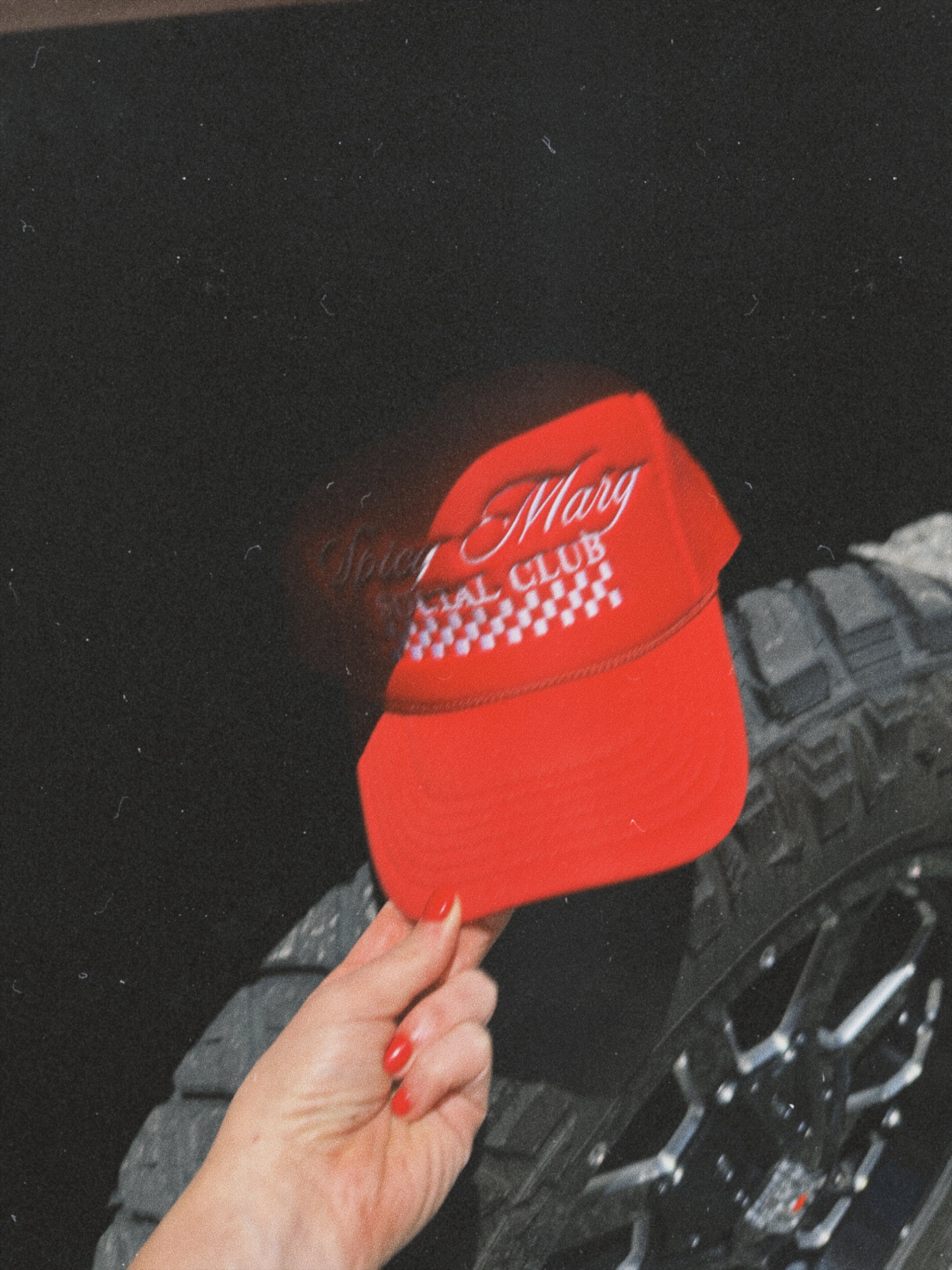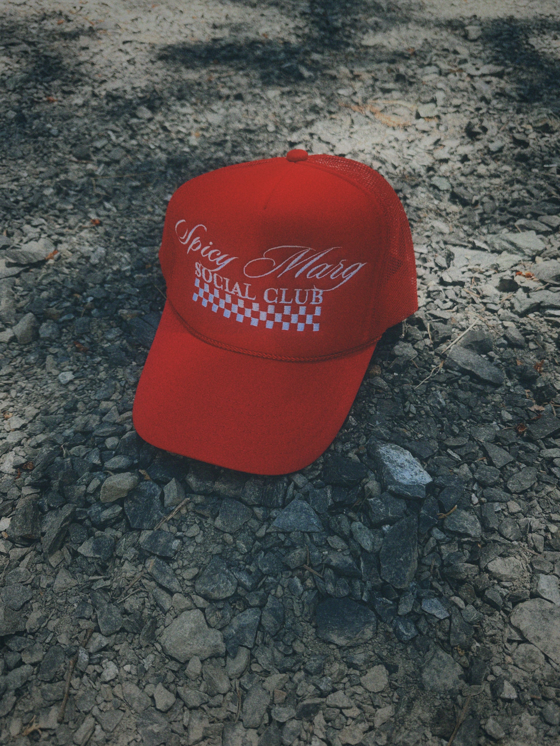 Trucker style captain hat with foam front + mesh back. "Spicy Marg Social Club" embroidered on the front with rope detail across brim. Adjustable snap back, one size fits all.