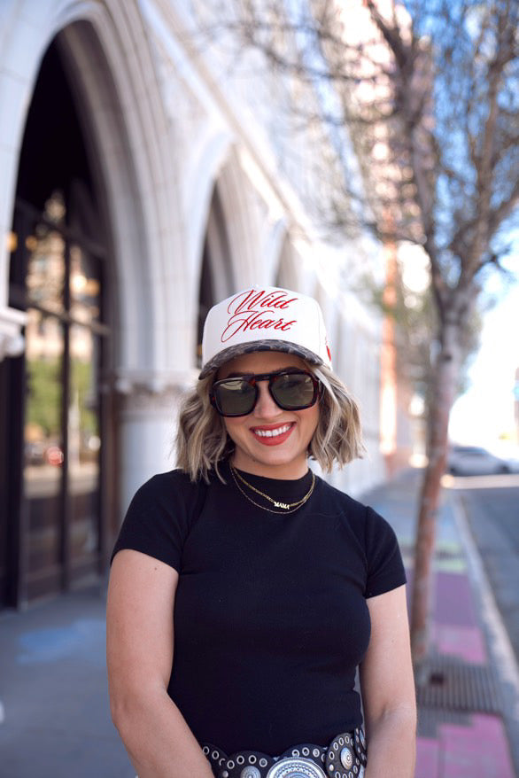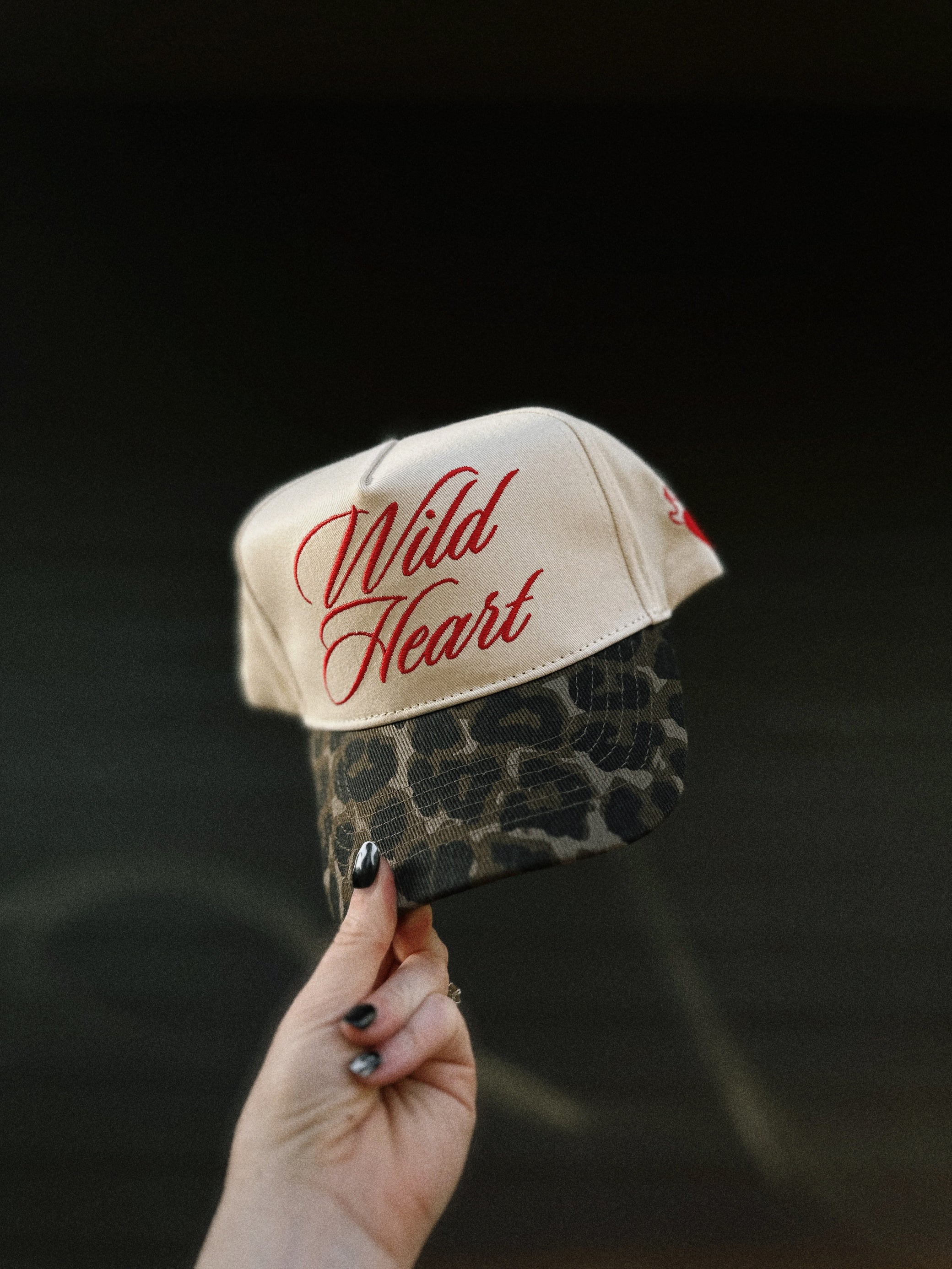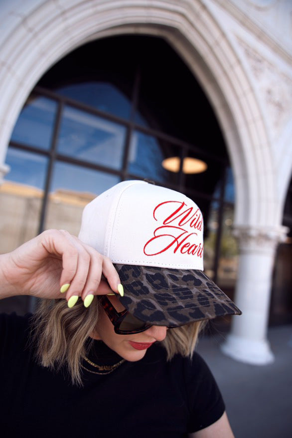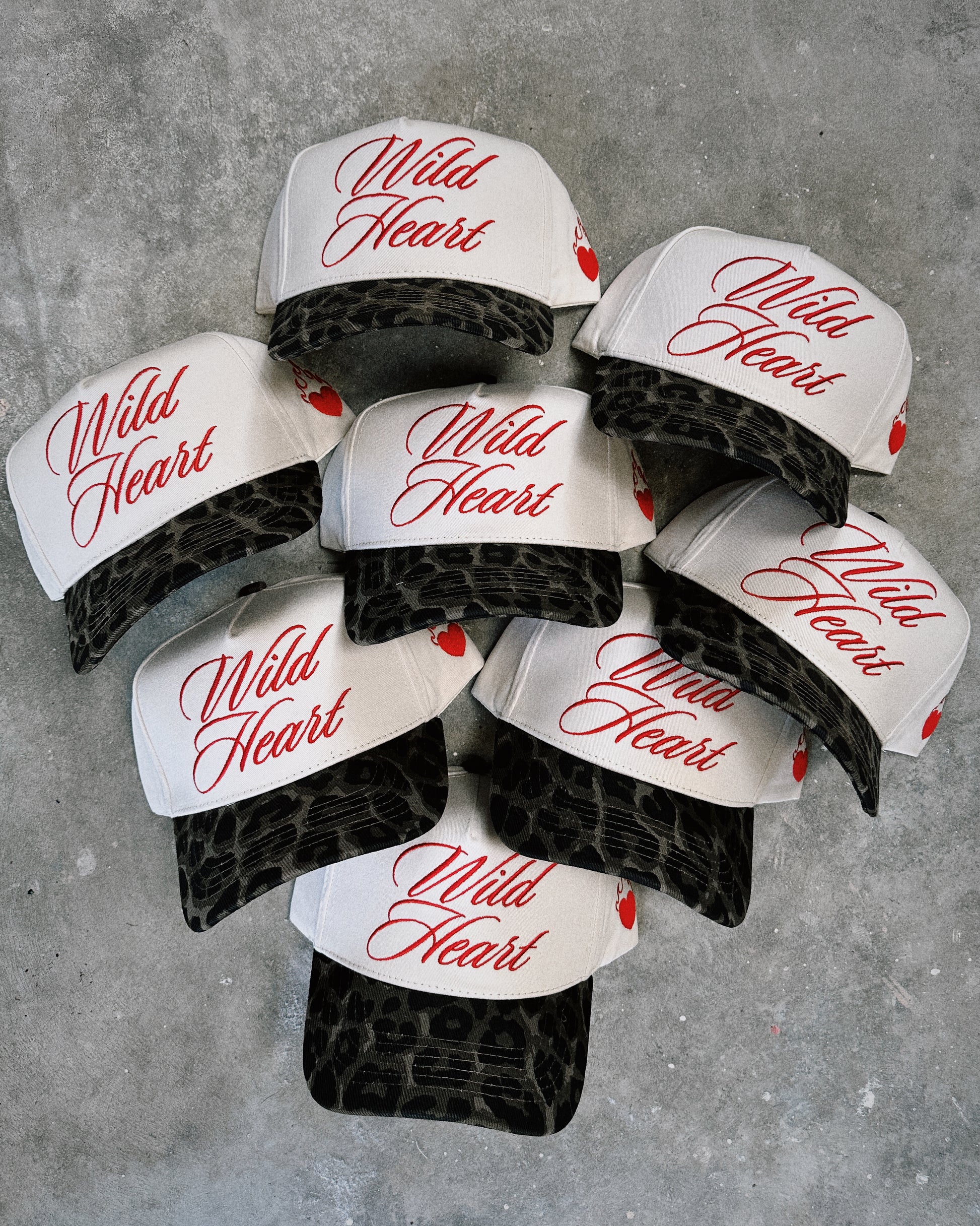 An exclusive cut and sew Slater Vintage structured 5-panel hat with Wild Heart embroidered on the front and a hand drawn flaming heart embroidered on the side. Cream canvas hat base and a leopard print bill with an adjustable snapback. Unisex sizing, so one size fits most y’all.